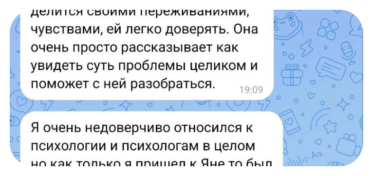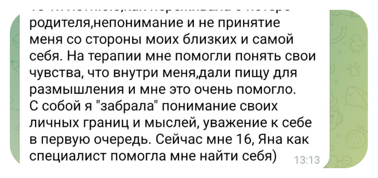 На наших встречах я вспоминаю себя 13-ти летнюю,как переживала о потере родителя,непонимание и не принятие меня со стороны моих близких и самой себя. На терапии мне помогли понять свои чувства, что внутри меня,дали пищу для размышления и мне это очень помогло. С собой я "забрала" понимание своих личных границ и мыслей, уважение к себе в первую очередь. Сейчас мне 16, Яна как специалист помогла мне найти себя)
