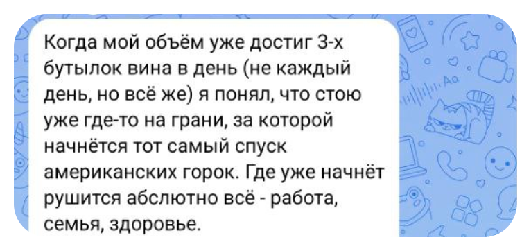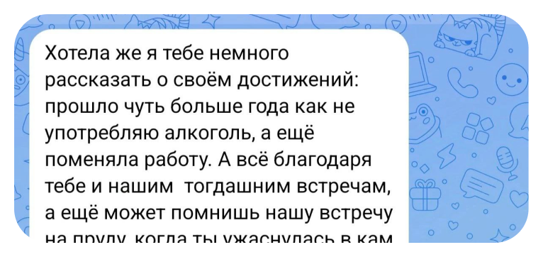 Хотела же я тебе немного рассказать о своём достижений: прошло чуть больше года как не употребляю алкоголь, а ещё поменяла работу. А всё благодаря тебе и нашим тогдашним встречам, а ещё может помнишь нашу встречу на пруду, когда ты ужаснулась в кам ком я ужасе живу, а я и не замечала и боялась говорить о своих желаниях ( ты мне тогда посоветовала прочитать книгу "Бунт удобной жены" я всё ещё обращаюсь к ней. К чему это я всё хочу сказать что классный психотерапевт. И желаю тебе побольше людей которым ты сможешь помочь