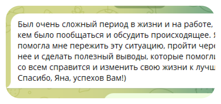 Был очень сложный период в жизни и на работе, не с кем было пообщаться и обсудить происходящее. Яна помогла мне пережить эту ситуацию, пройти через нее и сделать полезные выводы, которые помогли мне справится с ситуацией и изменить свою жизни к лучшему. Спасибо, Яна, успехов Вам!)