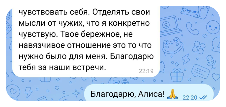 Алиса! В завершении нашей терапии мне хочется тебе сказать, что в наших травмах, в том, что болит, скрыт большой потенциал. Я желаю тебе рисковать и проявлять себя. То, творчество, что ты делаешь - это нужно тебе. И это нужно людям